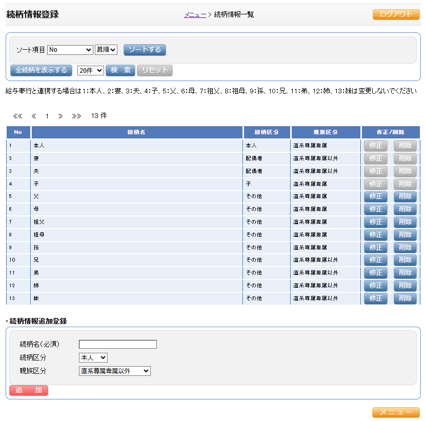 [修正]・・・・・・・・登録済の続柄情報を修正します。