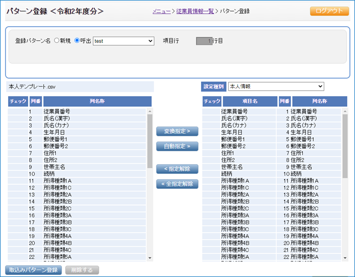 年度データCSV取込みの[パターン登録]をクリックして、パターン登録の画面を表示します。