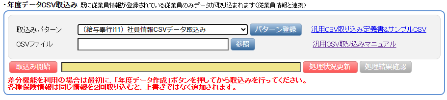 [汎用CSV取り込み定義書&サンプルCSV]から取込みに利用するCSVデータを準備して、パターン登録を行ってください。