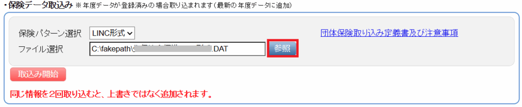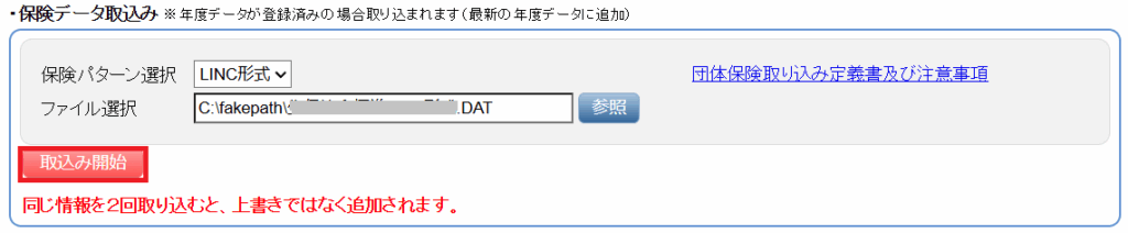 [団体保険取り込み定義書及び注意事項]を確認ください。(CSV取込画面にリンクがあります)
