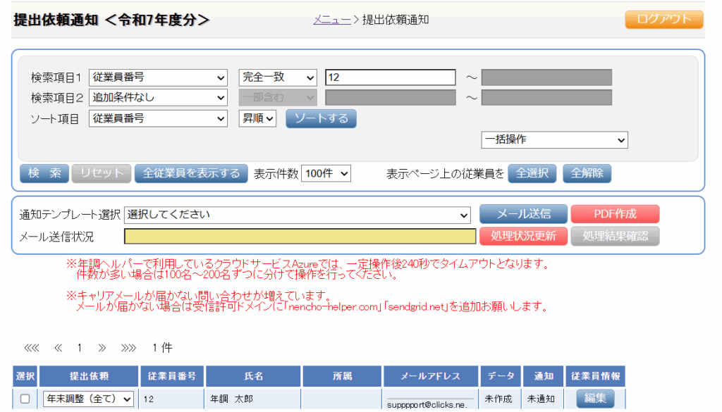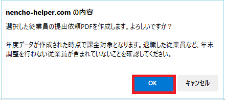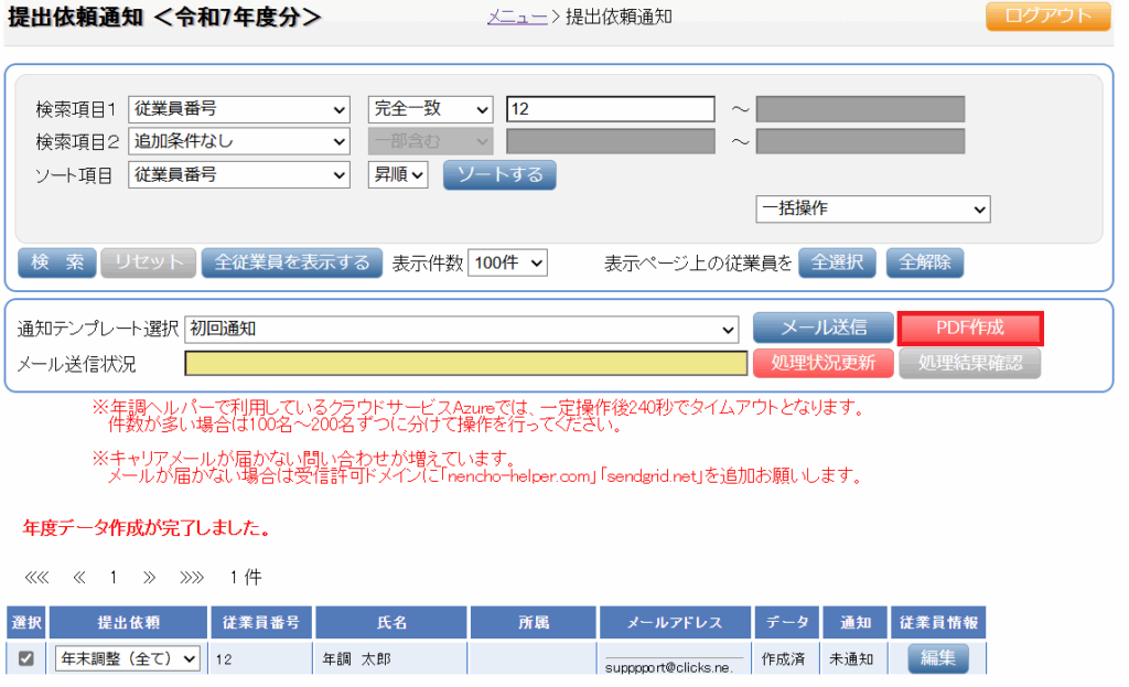 3、対象の従業員に「選択」のチェックを付けます。[PDF作成]をクリックします。