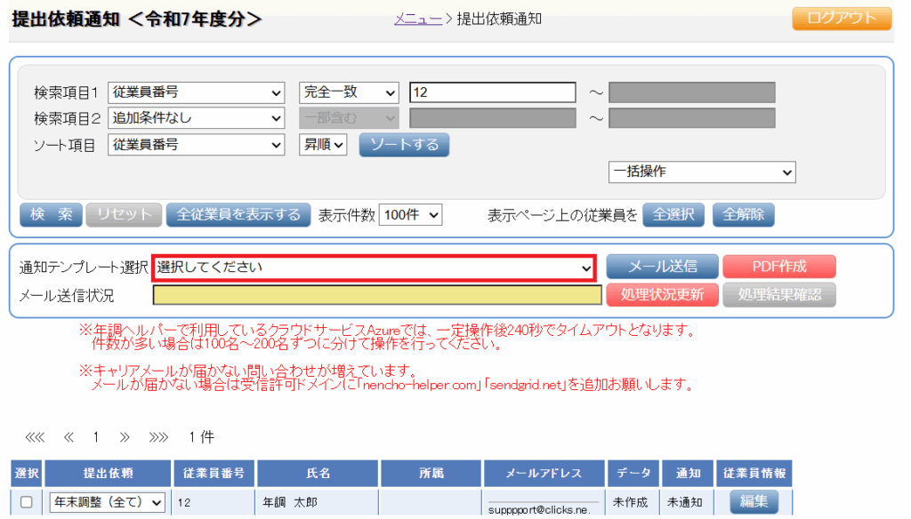 2、「通知テンプレート選択」のプルダウンで選択します。