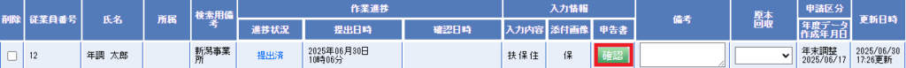 (1)該当の従業員の入力情報の申告書の[確認]をクリックして、申告書確認画面を表示します。