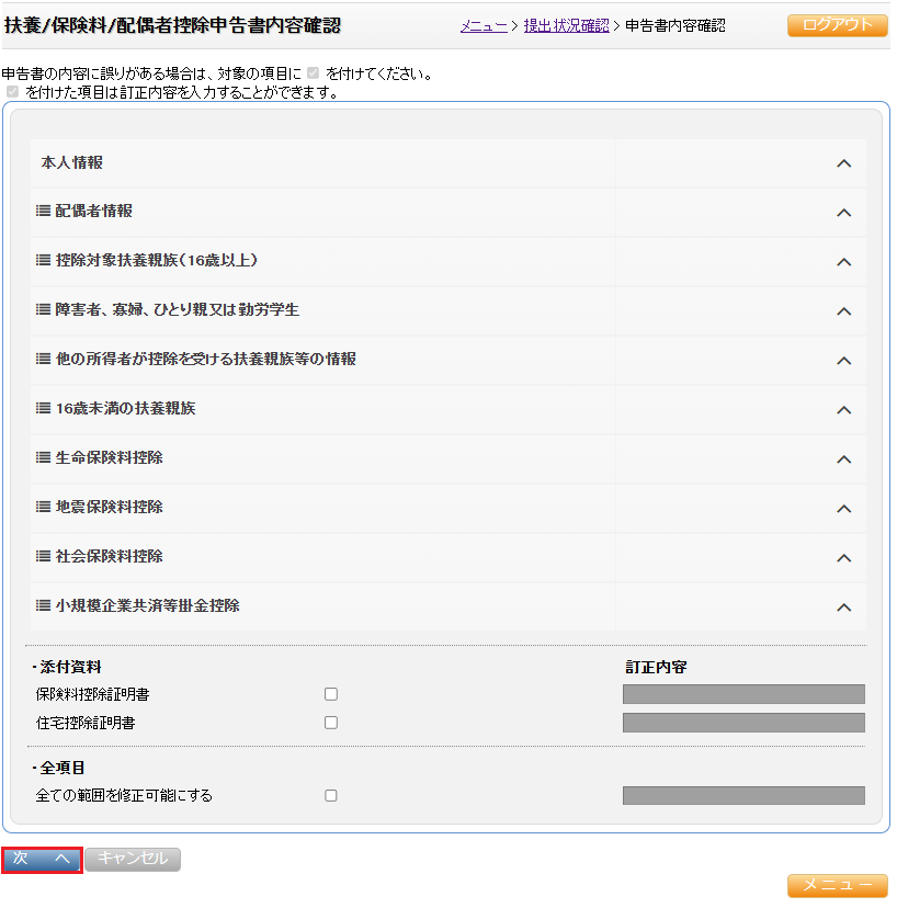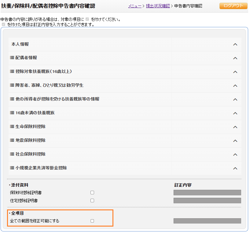 管理者が指定した修正箇所の大区分(本人、配偶者、控除対象扶親族(16歳以上など)のみ修正できます。
