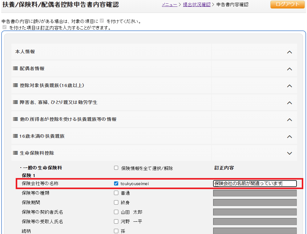 (4)訂正依頼する項目欄にチェックを付けて、訂正内容を入力します。(画像では生命保険料控除を選択しています)