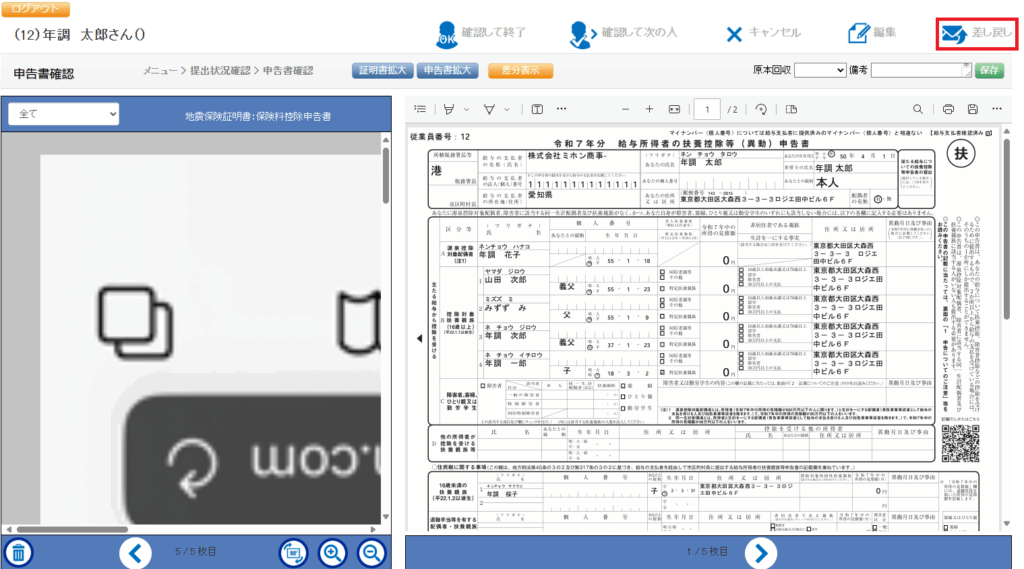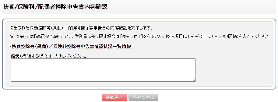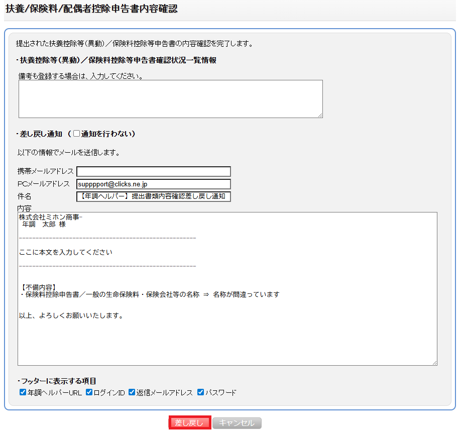 『申請書確認』画面で申告された内容に不備がある場合、差し戻しを行います。