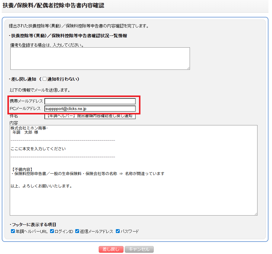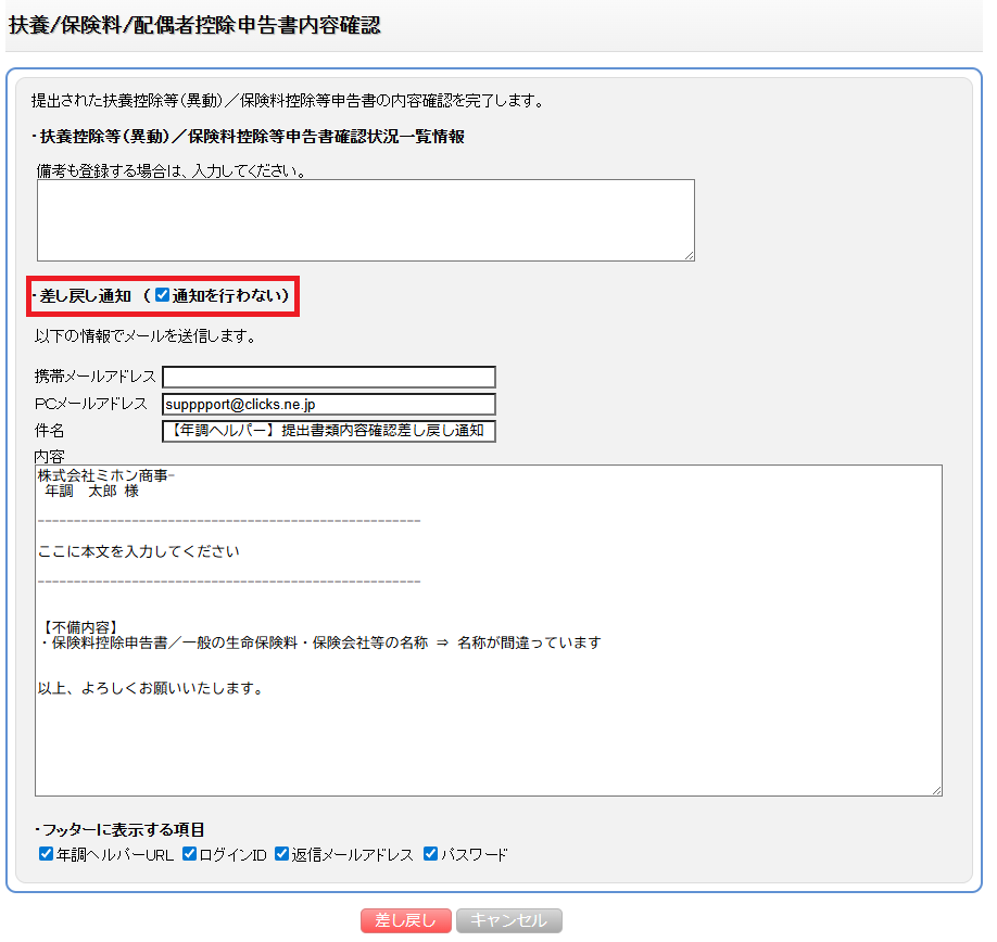 (6)差し戻し通知をメール送信する場合は、メールアドレスが入力されていることを確認してください。