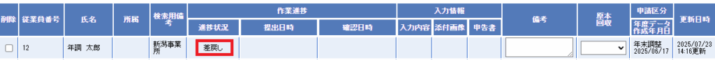 (10)該当の従業員の進捗状況が「差戻し」になります。