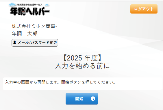 (1)通常通りIDとパスワードを入力してログインすると、「開始」ボタンが表示されています。
