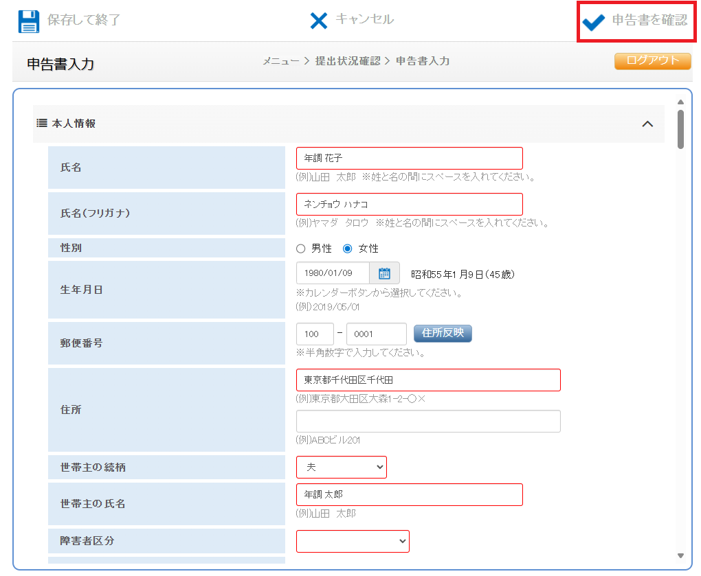 (8)「申告書を確認」をクリックすると、申告書を表示します。
