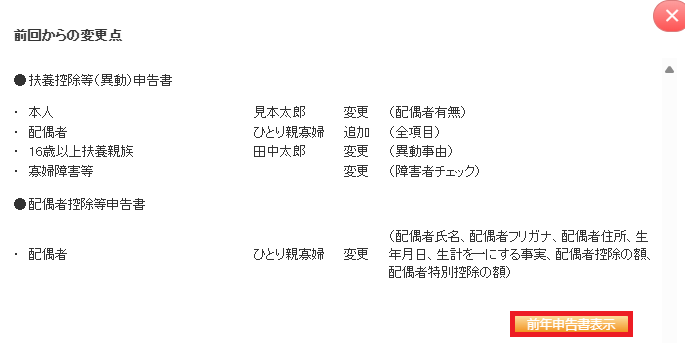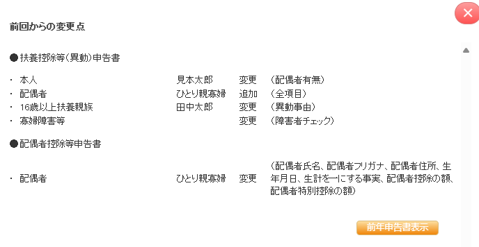 (4)前年のデータとの変更点を表示します。(画面は一例です)